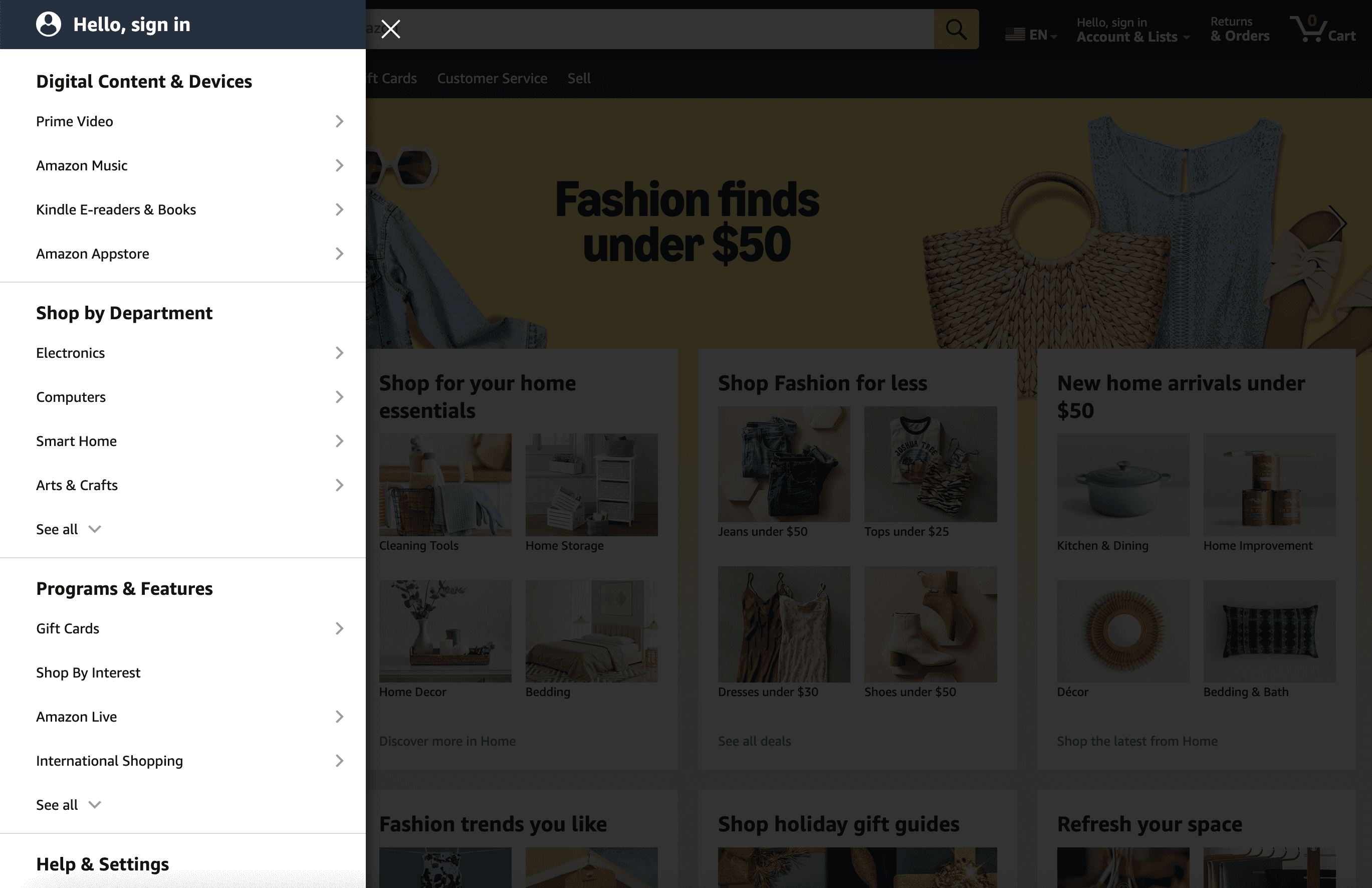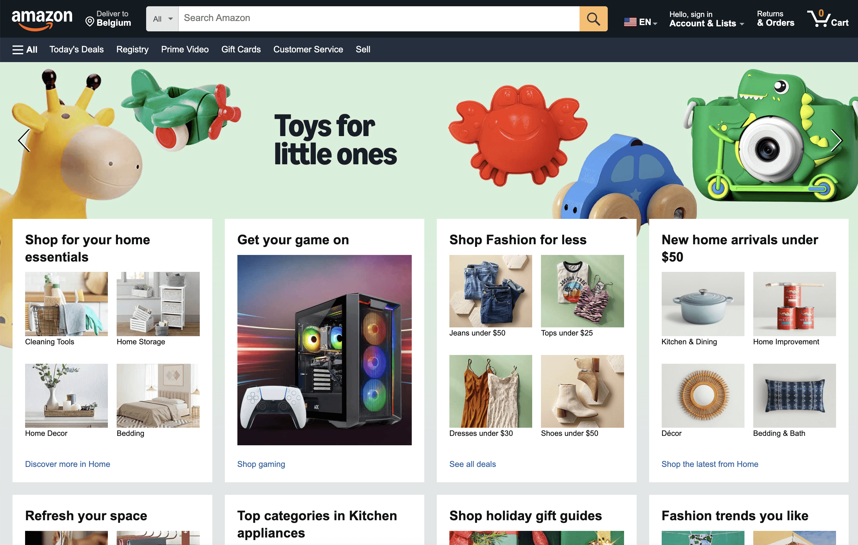 Amazon’s US homepage emphasizes personalized recommendations (“Your account,” “Inspired by your browsing”), highlighting individual autonomy.